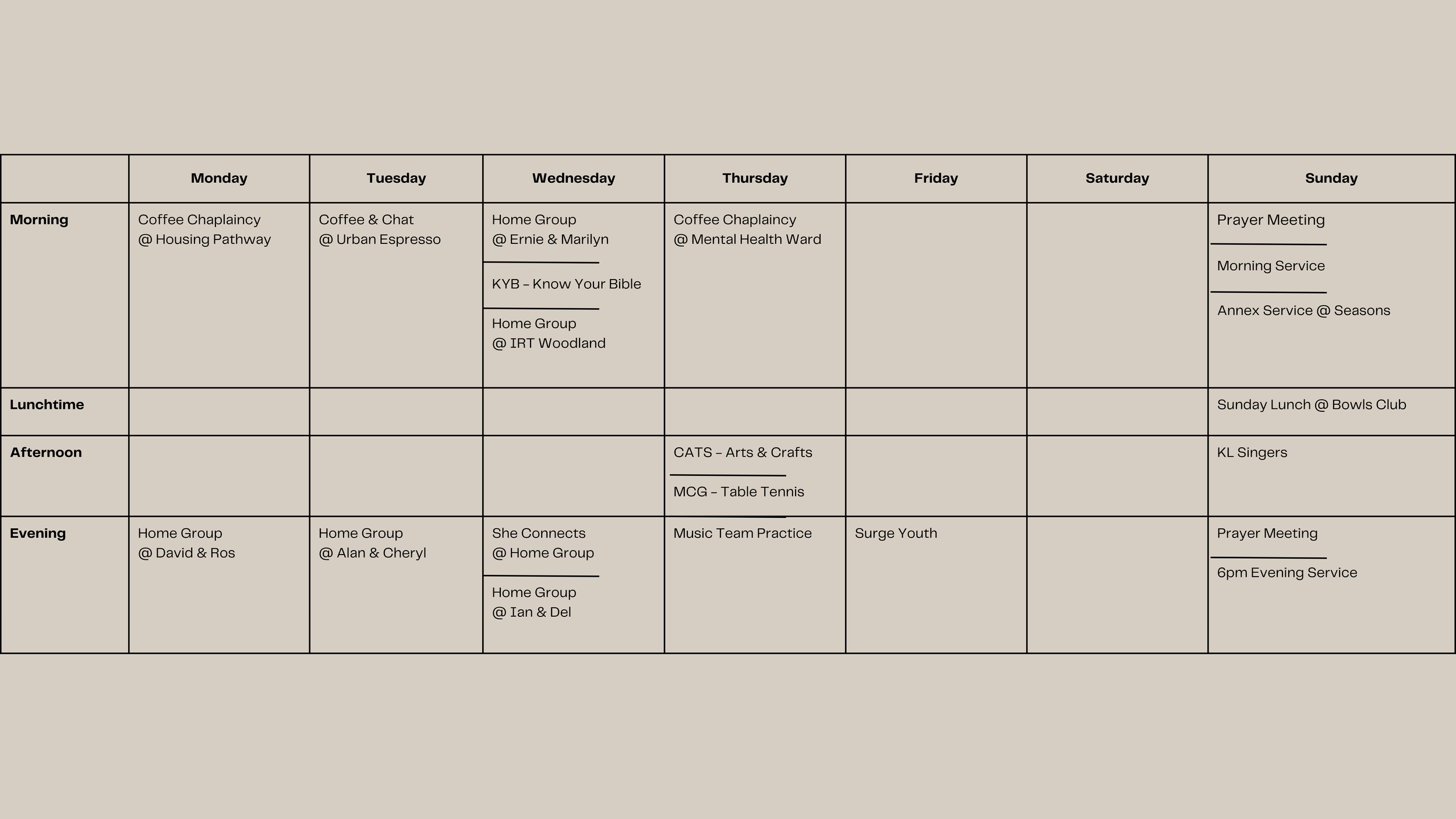 Meeting every Wednesday at 6.30pm to grow in God; to fellowship together and to pray.